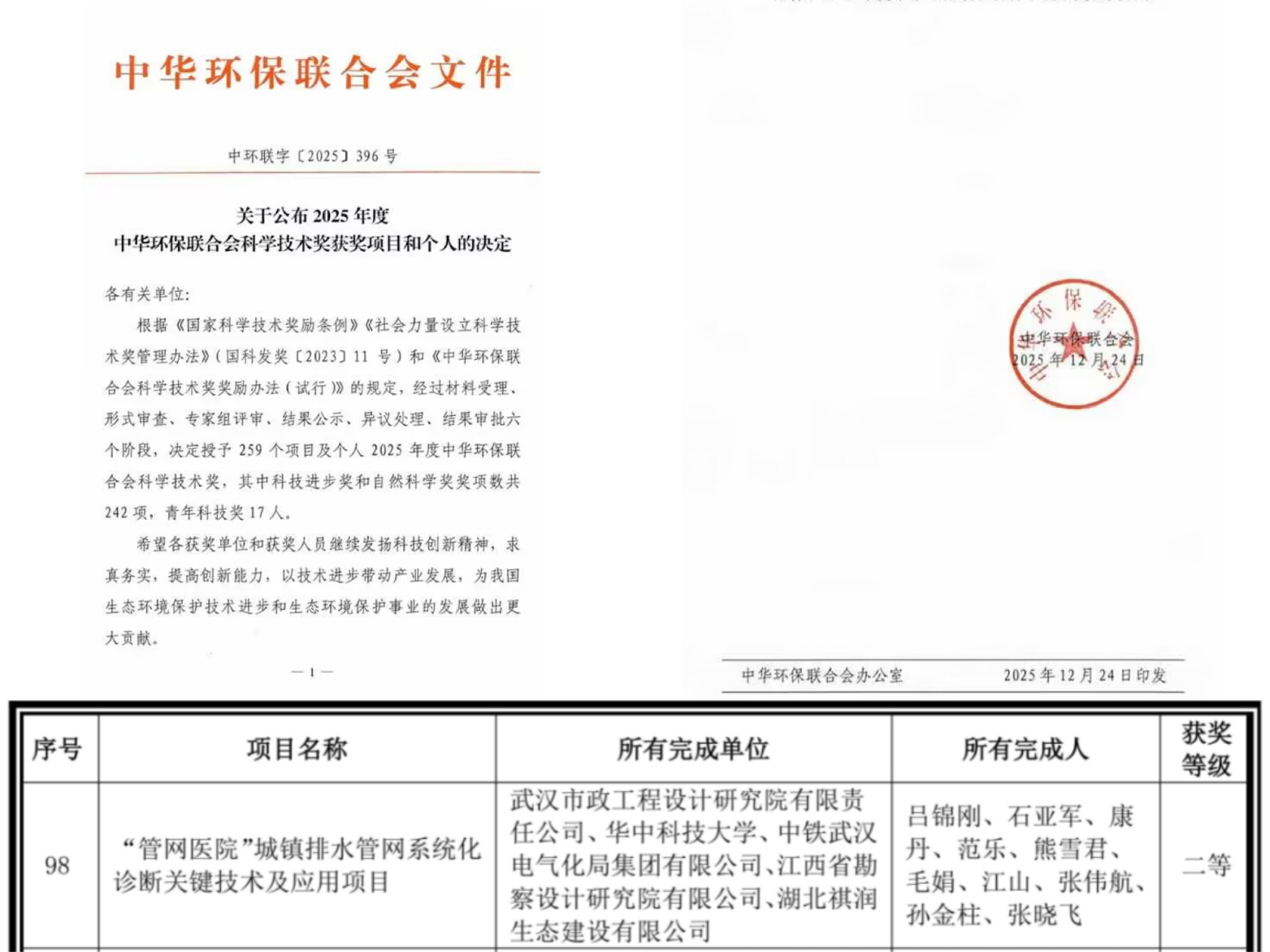 ? ? 近日,武漢市政院自主研發(fā)的“‘管網(wǎng)醫(yī)院’城鎮(zhèn)排水管網(wǎng)系統(tǒng)化診斷關鍵技術及應用研究”,經(jīng)中華環(huán)保聯(lián)合會在北京組織技術成果評價會議評審,順利通過科技成果評價,被認定為達到“國際先進水平”,并榮獲“2025年中華環(huán)保聯(lián)合會科技進步獎二等獎”。